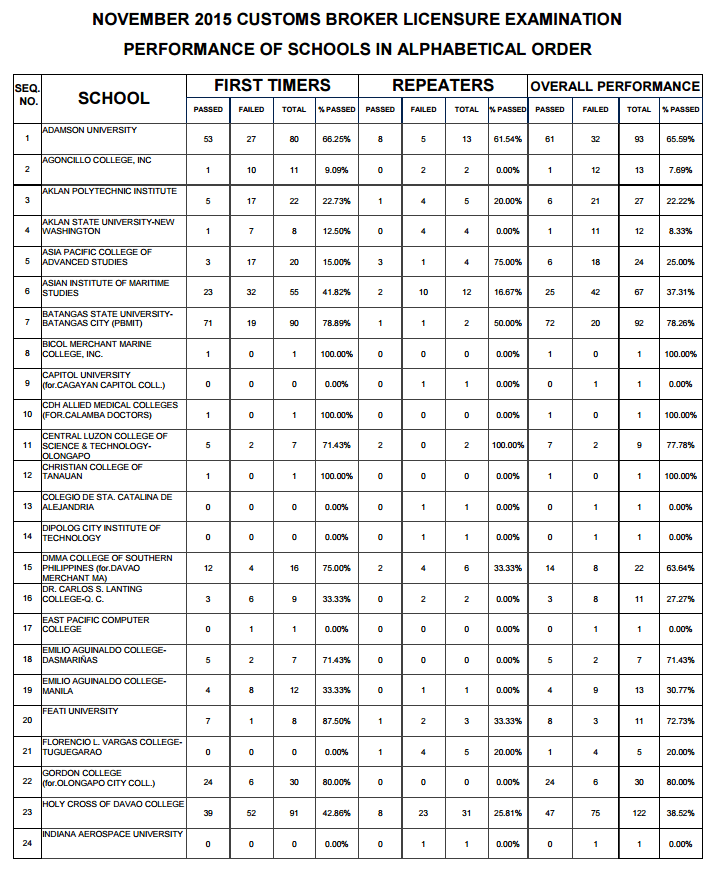 Meanwhile, listed below are the Complete Performance of Schools of the Nov. 2015 Customs Broker Board Exam: