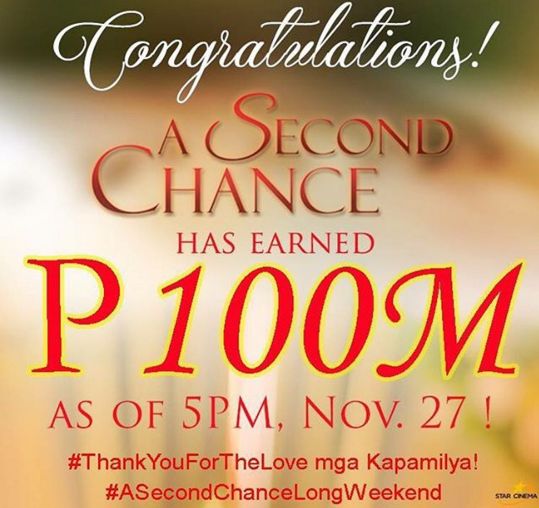 The John Lloyd Cruz and Bea Alonzo movie titled “A Second Chance,” has earned more than P100 million in box office income after just three days in cinemas nationwide, as the movie became one of the highest-grossing non-MMMF movie in the history of Philippine cinema.