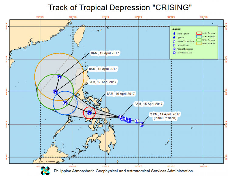 In its latest weather update, Philippine Atmospheric, Geophysical and Astronomical Services Administration (Pagasa) said the Tropical Depression Crising moves with maximum sustained winds of up to 45 kilometers per hour (kph) and gustiness of up to 55 kph. Crising is forecast to move west-northwest at 20kp according to the state bureau.
