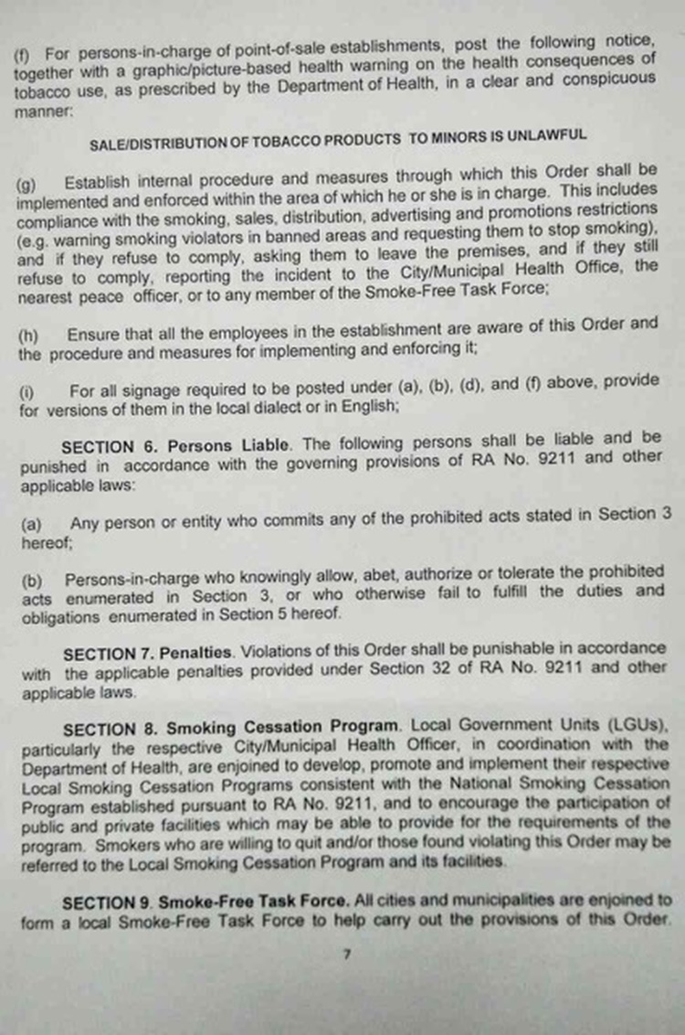 The Executive Order 26 defines the Designated Smoking Areas (DSAs) where smoking may be allowed in an open space or isolated area with proper ventilation. A building can have only one DSA and minors are not allowed.