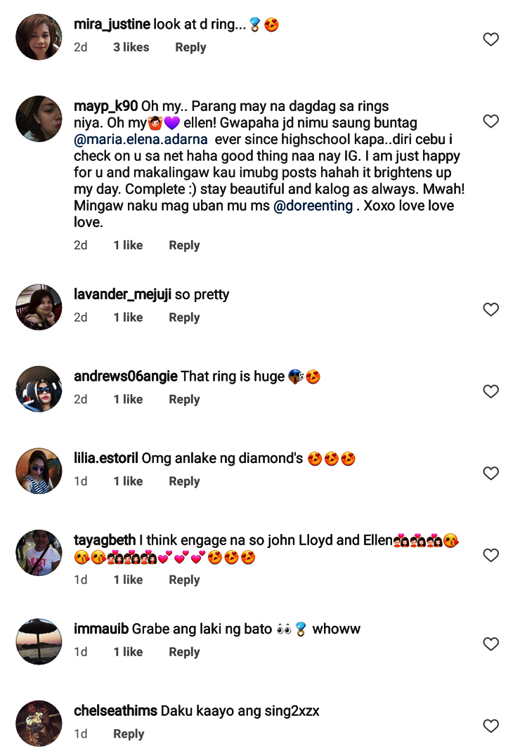 Oh my.. Parang may na dagdag sa rings niya. Oh my ellen! Gwapaha jd nimu saung buntag @maria.elena.adarnaever since highschool kapa..diri cebu i check on u sa net haha good thing naa nay IG. I am just happy for u and makalingaw kau imubg posts hahah it brightens up my day. Complete 🙂 stay beautiful and kalog as always. Mwah! Mingaw naku mag uban mu
