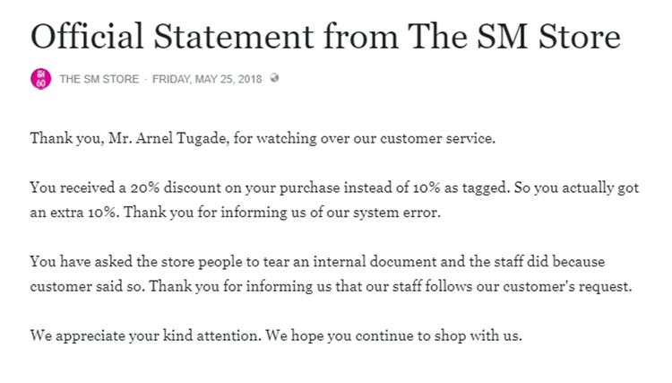 Recently, on its social media account, The SM Store released a statement regarding the complaint of the shopper. The statement is addressed to Mr. Arnel Tugade. Based on the statement, 20% discount was allegedly availed by the shopper as there was a system error.