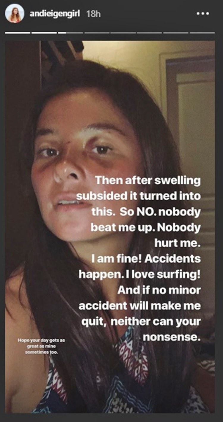 “So NO. Nobody hurt me. I am fine! Accidents happen. I love surfing! And if no minor accident will make me quit, neither can your nonsense,” Andi Eigenmann stressed out.