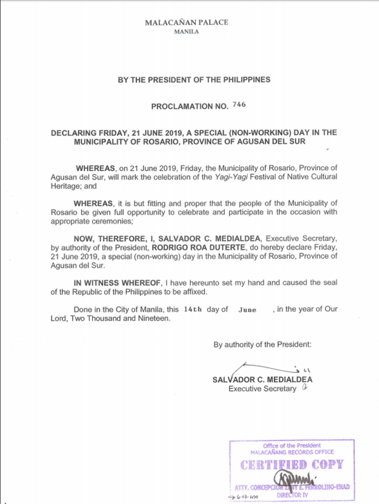 - Proclamation No. 746 ā Declares June 21 as a special non-working holiday in the Municipality of Rosario, Agusan del Sur to celebrate the Yagi-Yagi Festival of Native Cultural Heritage.