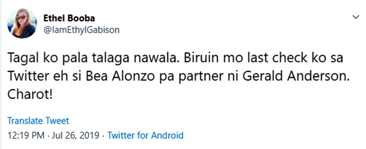 “Tagal ko pala talaga nawala. Biruin mo last check ko sa Twitter eh si Bea Alonzo pa partner ni Gerald Anderson. Charot!” Ethel wrote. Her post received various reactions from netizens.
