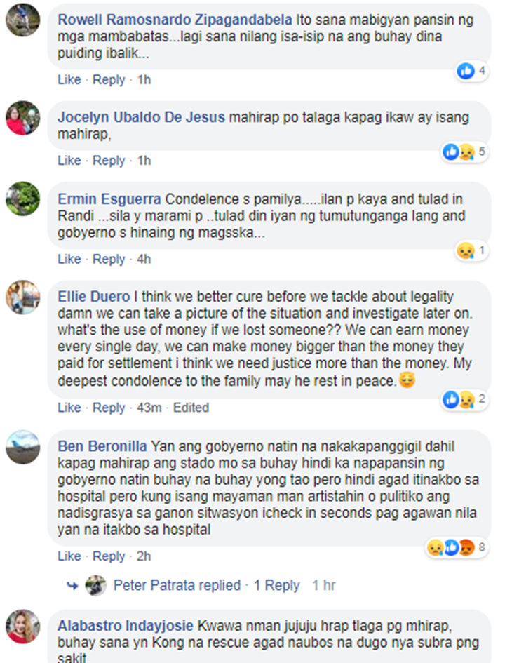 Hindi ko kilala ang naka aksidente sakanya, pero nakakagalit, habang tinitingnan ko ang pictures na kuha ng bystanders.. pinapanuod lang sya habang untiunting namamatay. At sa huli aalokin nila ang pamilya nya ng 50k para sa settlement, at patay na sya! Kaya ko din po kayo alukin nyan, basta papayag po kayong sagasaan ko din kayo!