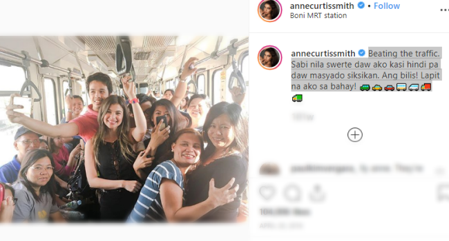 Anne Curtis also had a post on Instagram of her riding the MRT to beat the traffic. She captioned:
