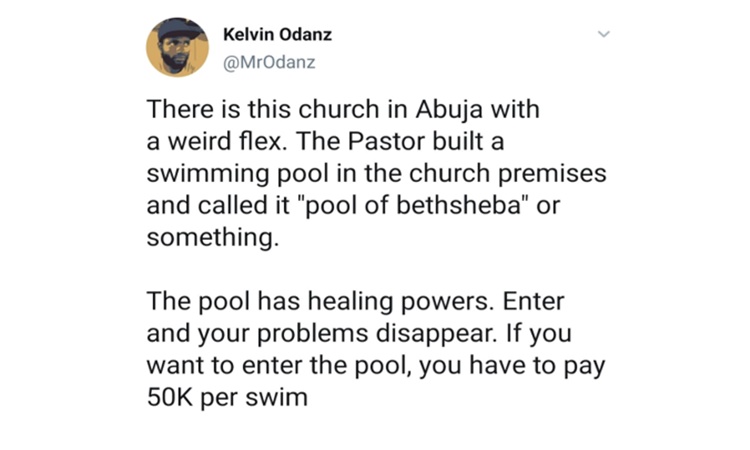 Recently, a Twitter user named Kevin Odanz said a pastor in Kubwa, Abuja built a swimming pool that has “healing powers” in his church. The minister called it the “Pool of Bethsheba.” However, the name of the pastor was not revealed in his posts.