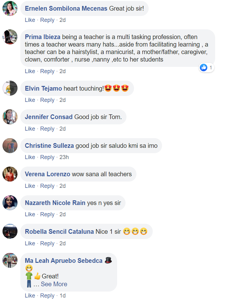 Panay News shared the photo with the caption “Teacher, Hairstylist!”. It was found out that Thom Christian Tamaño was only a substitute teacher that time. According to Teacher Thom, he believed the teachers were second parents so he did this to his students.