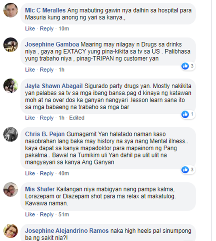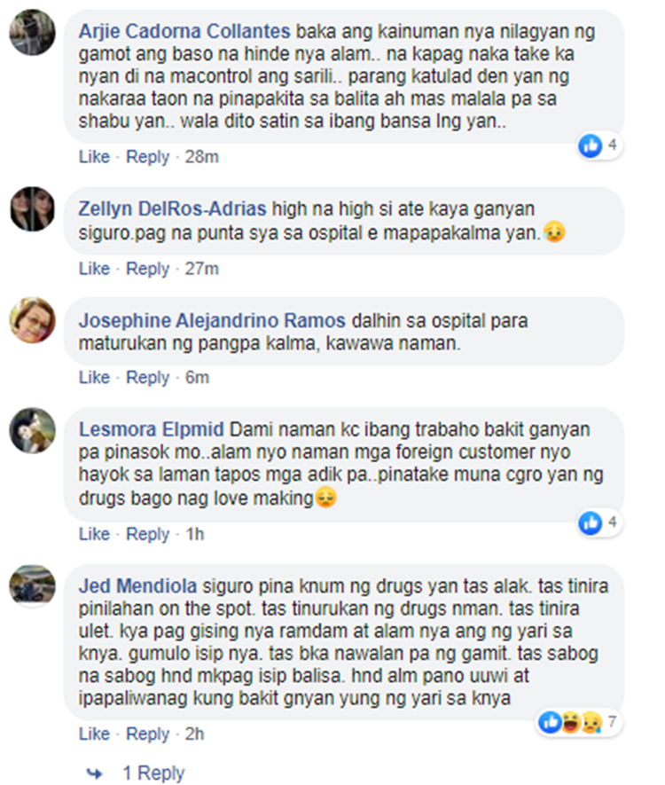 “meron isang babae na galing dw sa kanyang costumer kagabi na isang Koreano, normal naman dw po sya kagabi sa inuman at party pero ngyn pag-uwi dw nila ganito na nangyari sa kanya. Halos hndi makausap ng matino, ngshake ang katawan nya, zombie mode attitude sya.”