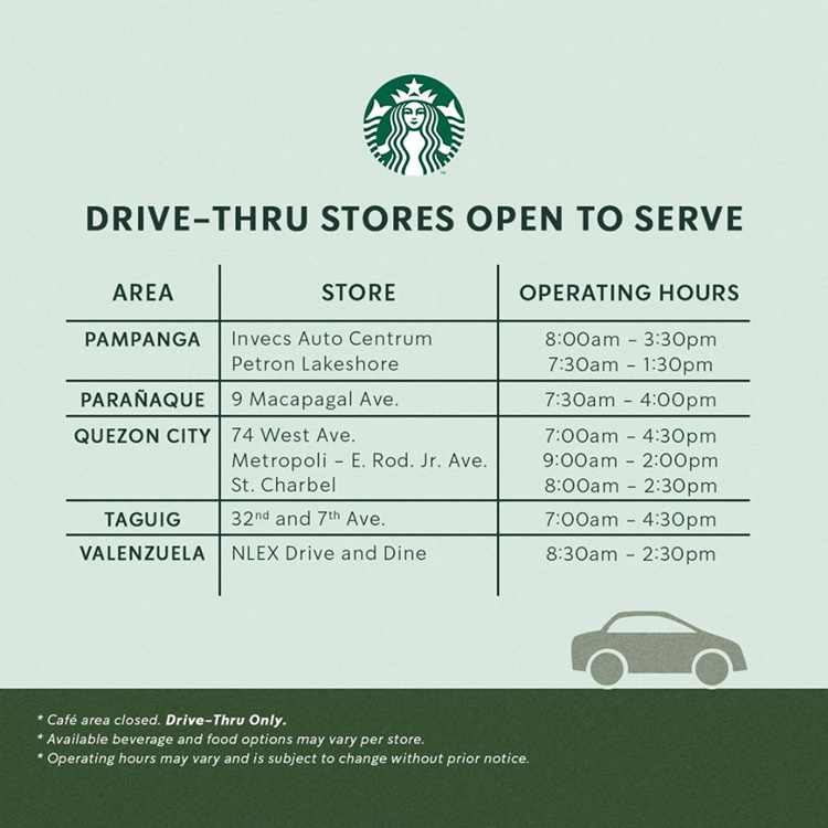 Starbucks Philippines announced the opening of selected drive-thru stores starting April 9 amid the enhanced community quarantine.