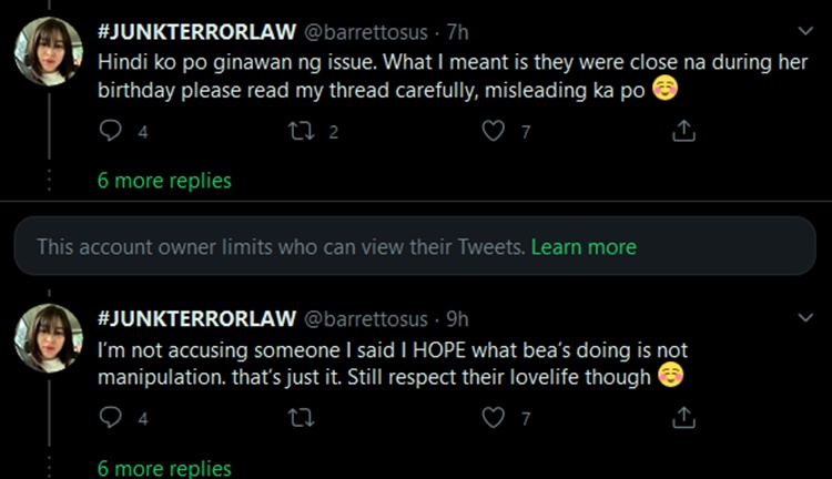 However, Twitter user @barrettosus accused Bea Alonzo of manipulating the public during the height of the issue between her, Gerald, and Julia.