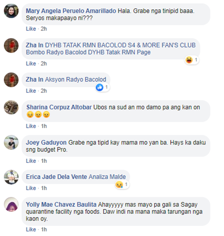 A disappointed lady has posted the photo of tiny food served to her mother staying at a quarantine facility in Bacolod City.