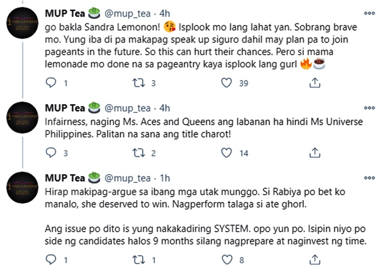 Twitter user @mup_tea revealed the identity of the characters in the post with the caption: “The truth about Sandra Lemonon and Shamcey Supsup tea Rabiya Mateo deserved it tho but the tea was about the Org not the winner alone.”