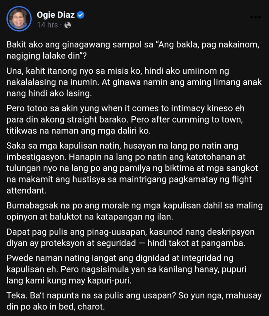 Comedian/talent manager Ogie Diaz reacted to the recent viral statement on social media “ang bakla, kapag nalasing, nagiging lalaki rin”.
