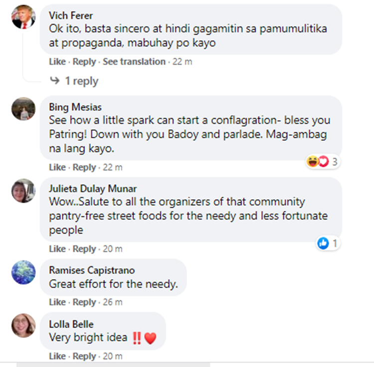 The pantry is a part Ambagan PH, a group of community pantries nationwide giving free snacks to the needy. Group secretary Jonathan Caiña that they have used the donations and worked with a street food vendor to hold the program.
