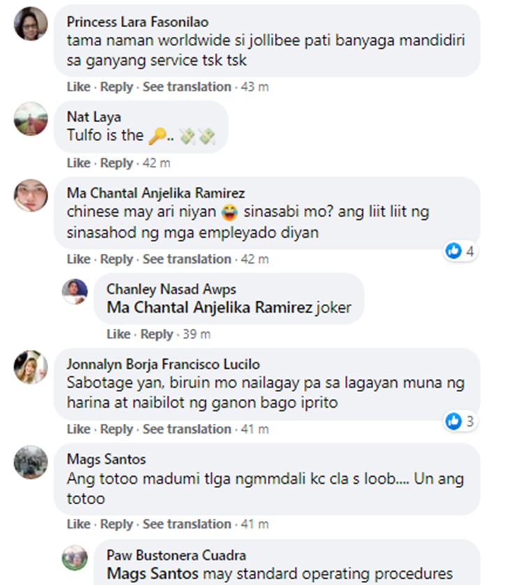 “See? Look of the damage na ginawa ng complainant towards Jollibee? No damage has been done sa part nya. Bakit di nalang inayos to internally with Jollibee? May pa-tulfo pa? Ano effect? It’s a Filipino brand na sikat all over the world then because of this incident nabawasan yung tiwala ng mga tao not only Filipinos but also sa foreign countries. Sorry to say this, pero sobrang OA lang. Hindi ko din maintindihan sa karamihan sa kapwa natin Pilipino bakit pinagpyestahan masyado to? Hindi nyo man lng inisip na it’s our own??? It’s a Filipino pride brand. Bakit ganun? Masaya kau? I’m not being biased but it can be resolved internally.