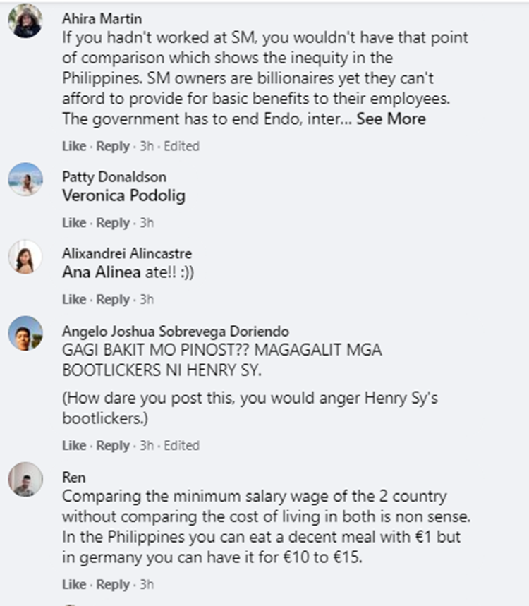 Karl said that SM Supermarket is paying their employees with a few pesos above the minimum wage while ALDI offers 9 Euros per hour starting salary. PH supermarkets require workers to sow their jeans while establishments abroad were not worries about it.
