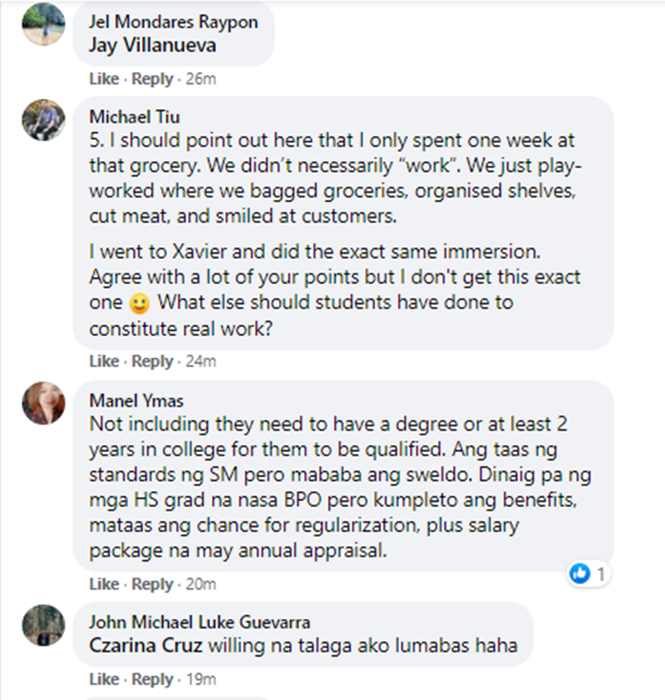 5. I should point out here that I only spent one week at that grocery. We didn’t necessarily “work”. We just play-worked where we bagged groceries, organised shelves, cut meat, and smiled at customers. Even if Xavier meant well to get its students to sympathize with the working class, it was basically poverty porn. Some of my batchmates told me that they got angry stares from the employees. I couldn’t blame them after all. Imagine rich kids entering your workplace to learn about “how hard life is.”
