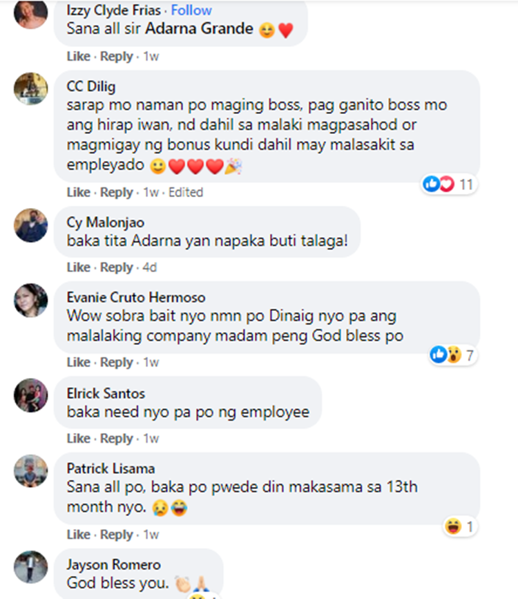 The Facebook account “Adarna Grande” has shared the photos of their employees’ 13th month pay, which has been released as early as November. The post immediately spread like a wildfire online and elicits comments from the netizens.