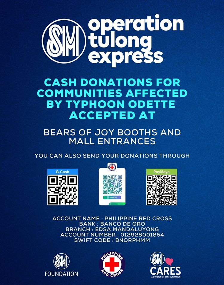 Donations for the communities affected by Typhoon Odette will be accepted in 86 SM malls nationwide, including 8 SMDC malls. There are 3 ways to give – through cash donation boxes located at the SM Cares Bears of Joy booths and mall entrances, through direct deposit to the Philippine Red Cross (Account Name: PHILIPPINE RED CROSS; Banco De Oro – EDSA, Mandaluyong Branch; Account Number: 012928001854; SWIFT CODE: BNORPHMM) and through scanning the PRC QR codes below. All proceeds will go directly through the PRC, a partner of SM Cares and the SM Foundation, Inc.