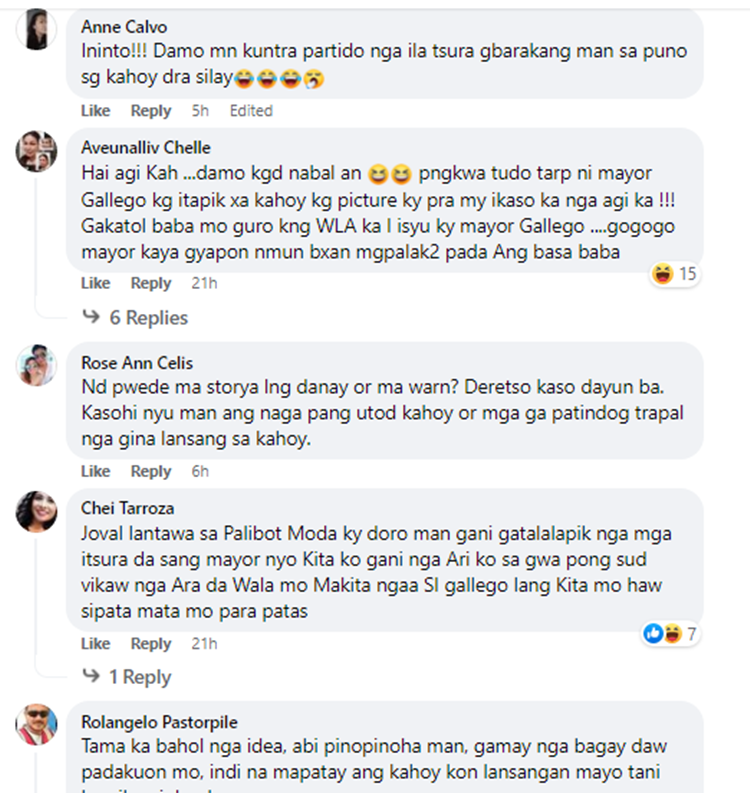 According to Catanghal, Gallego’s campaign materials were installed on 24 trees using nails. Campaign posters are located along the National Highway at Barangay Guinhalaran in the town of Silay.