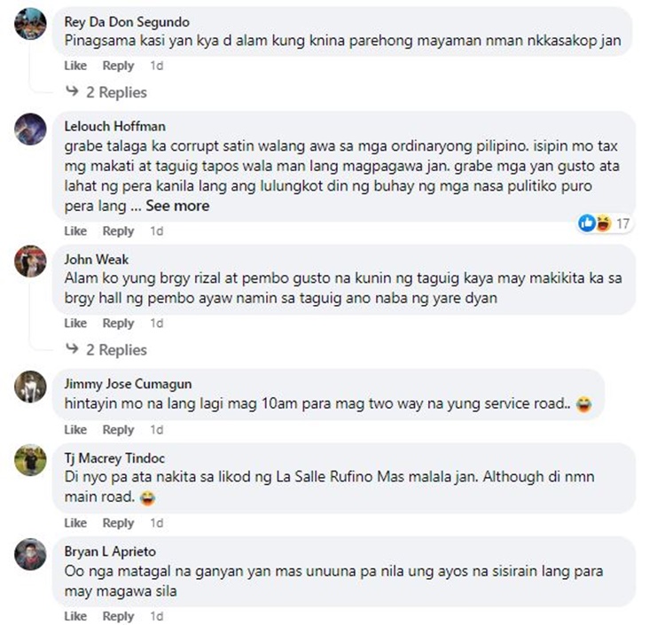 “Report ko lang po yung Maya Street sa Brgy. Rizal, Makati City, going to Levi B. Mariano Avenue, Taguig City. Hindi malaman kung sino ang magpapagawa. Taguig o Makati ba? Matagal na ito.”