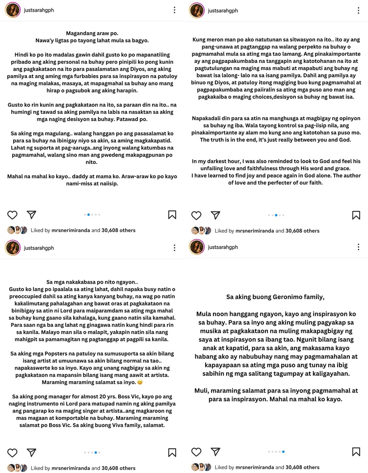 Popstar Royalty Sarah Geronimo has deleted her viral apology post for her parents Daddy Delfin and Mommy Divine Geronimo.