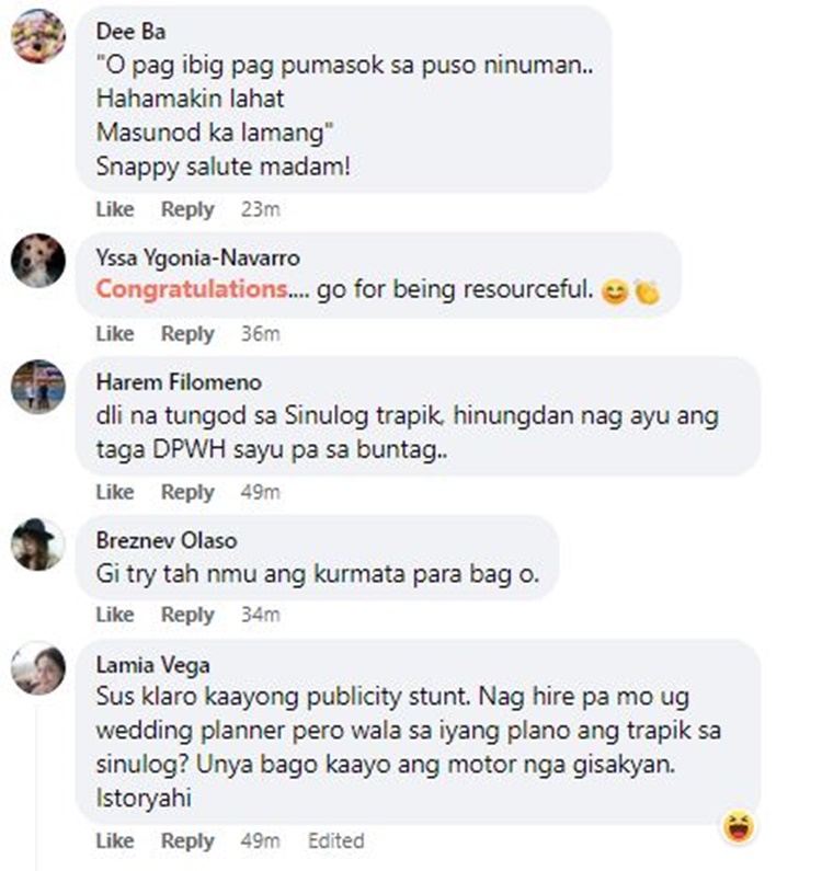 In the photos, the bride identified as Jessica Marie Capul Lubay-Bunado rides a motorcycle taxi (Angkas) to avoid heavy traffic congestion near the venue for the Sinulog Grand Parade.
