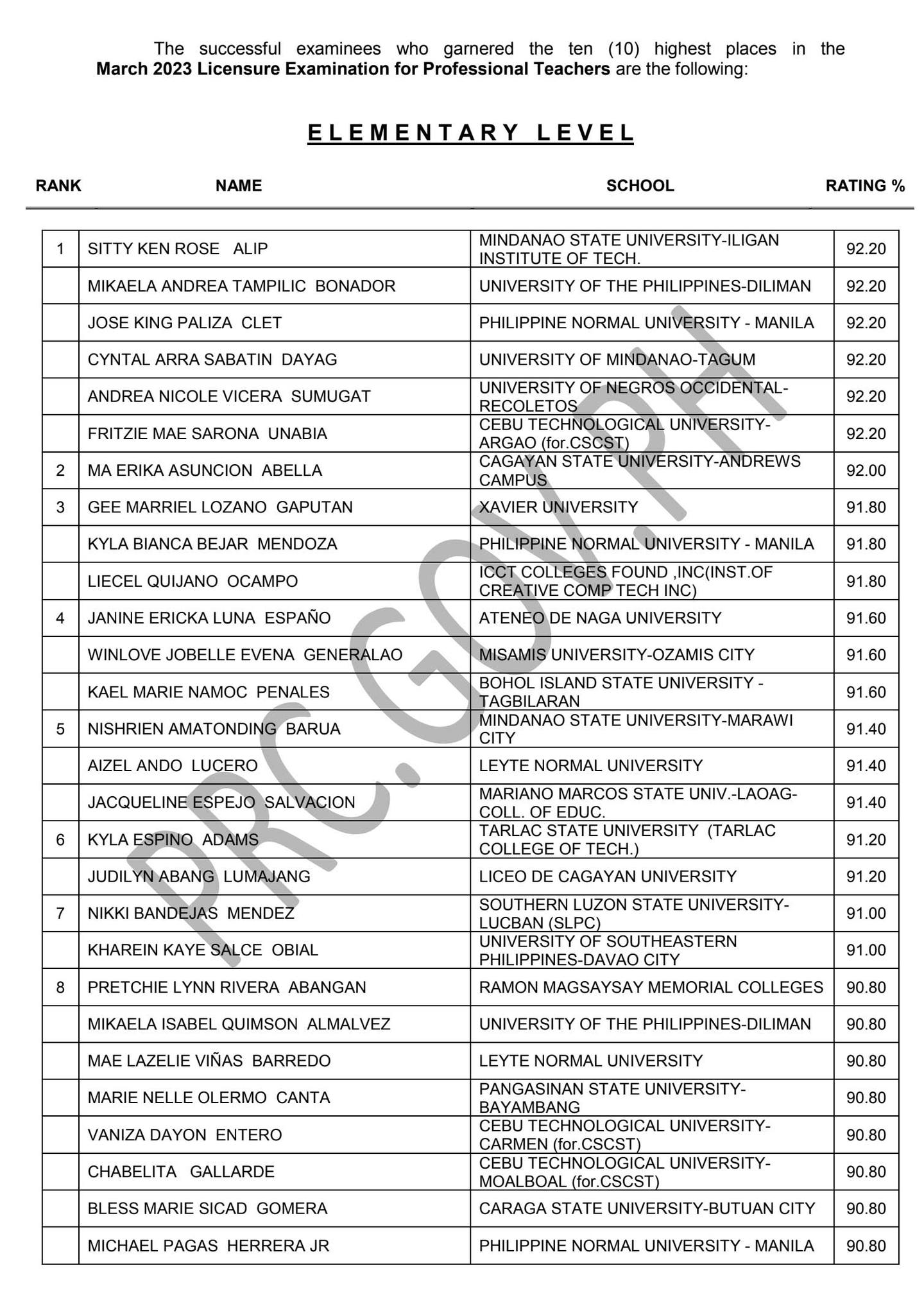 Here is the LET Board Exam Result March 2023 including the Top 10 Passers (Elementary Level) as per released by PRC.
