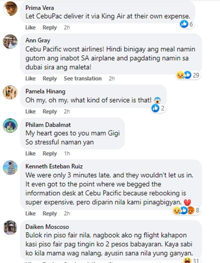 De Lana criticized the company for not informing them of the incident. She reprimanded Cebu Pacific for providing poor service in comparison to other domestic airlines.
