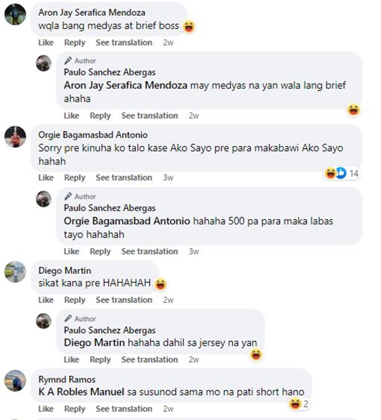 “Sa kumuha ng jersey eto na yung short tsaka sapatos balikan mo nalang. Mamaya 1st 5 ka,” Abergas wrote.