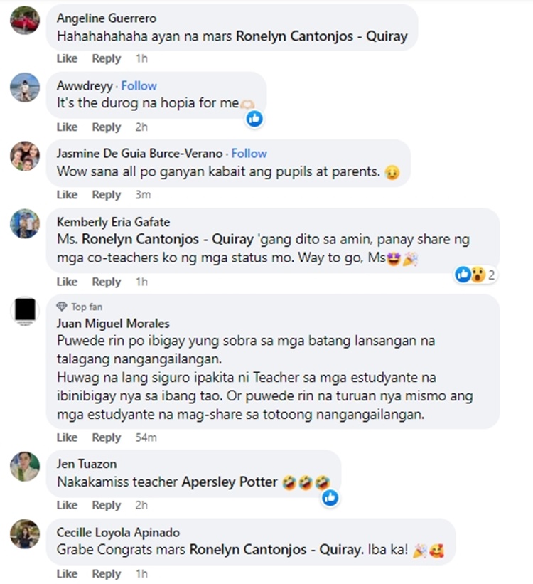 “Minsan may isang hiwa po ako ng mansanas, pipino, nadurog na hopia, pakpak ng fried chicken at kung anu-ano pa pong inaabot nila Nagpapasalamat po ako sa blessing na bigay nila. Maybe for some, iniisip na sipsip or what ang ganitong way pero sa mga bata kasi they are pure. Gusto lang talaga nila ipakita na naappreciate nila ang teacher,” Ronelyn said.
