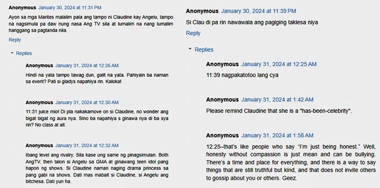 These were shared on a popular showbiz site and netizens expressed different reactions. Some said that the feud between Claudine and Angelu started way back when they were both part of Ang TV, the 90s kiddie gag show on ABS-CBN. Some said that there had been a rivalry between the two actresses while others said that Claudine Barretto should move on already. Here are some comments.