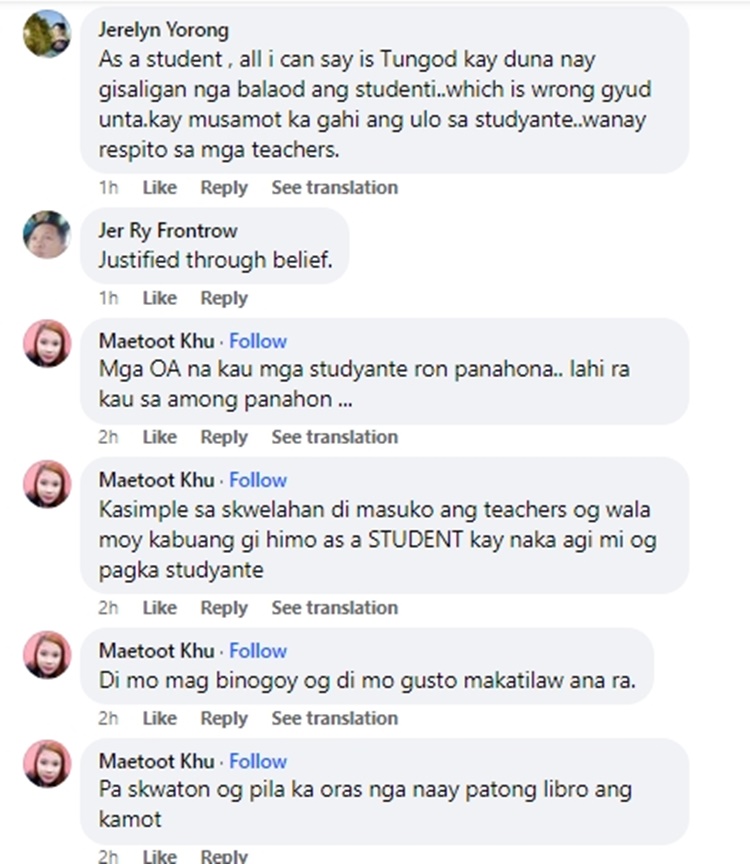 I hope this whole situation will serve as a lesson on both ends. May the rightful justice be served on both ends. For all the loving parents who want the best for their children, always check on them to see if they’re doing well and fine in school before it’s too late. For our ever hardworking “MAGTUTUDLO”, laban ug padayon. Continue to guide your students in the best way possible. Ako nga usa sad ka magtutudlo, dili lalim atong mga ge agian ug pangpaningkamot para sa atong mga bata, pero ato gihapong barugan ang atong pangalan isip ikaduhang ginikanan sa atong mga estudyante sa maayo ug saktong pamaagi.