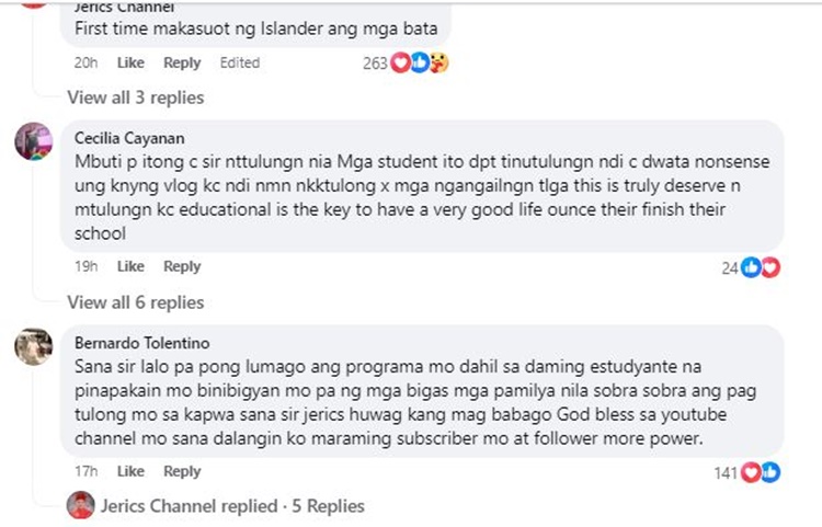 “First time makasuot ng Islander ang mga bata.Hindi hadlang ng mga estudyante ang mga sira-sira nilang tsinelas sa pagkamit ng kanilang mga pangarap. Pupunta sa school kahit sira ang tsinelas kaya malaking blessing sa mga bata ang mga munting regalo from God. Ang tsinelas ay simbolo ng ating pagsisikap dahil magsisilbi itong proteksiyon sa paglakad patungo sa ating tagumpay. Salamat sa Diyos.”