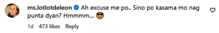 “Ah excuse me po.. Sino po kasama mo nag punta dyan? Hmmmm…” the seasoned actress asked her daughter. Lotlot included a smiling face with sunglasses emoji in her comment.