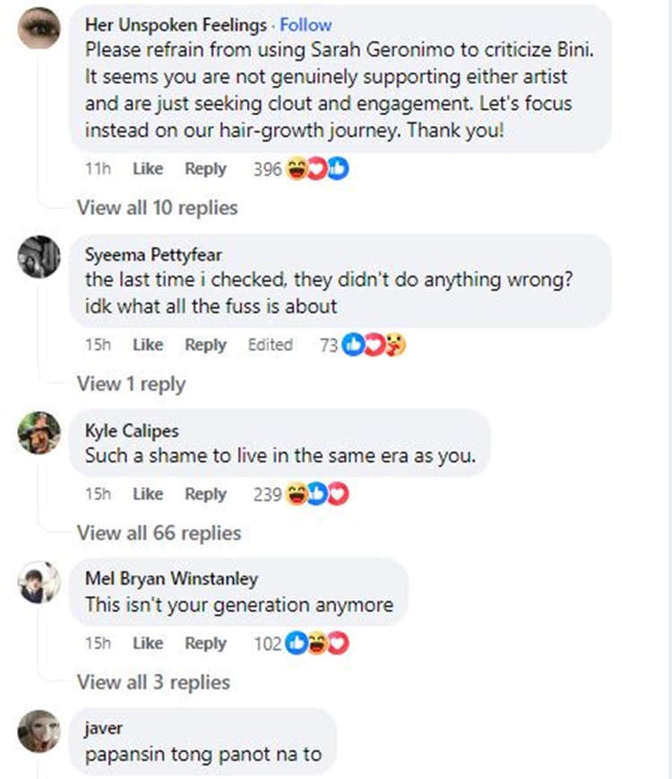 Relativo compared the girl group to Popstar Princess Sarah Geronimo. He praised Geronimo for her ability to handle controversies and criticisms gracefully, explaining that BINI lacks this maturity.