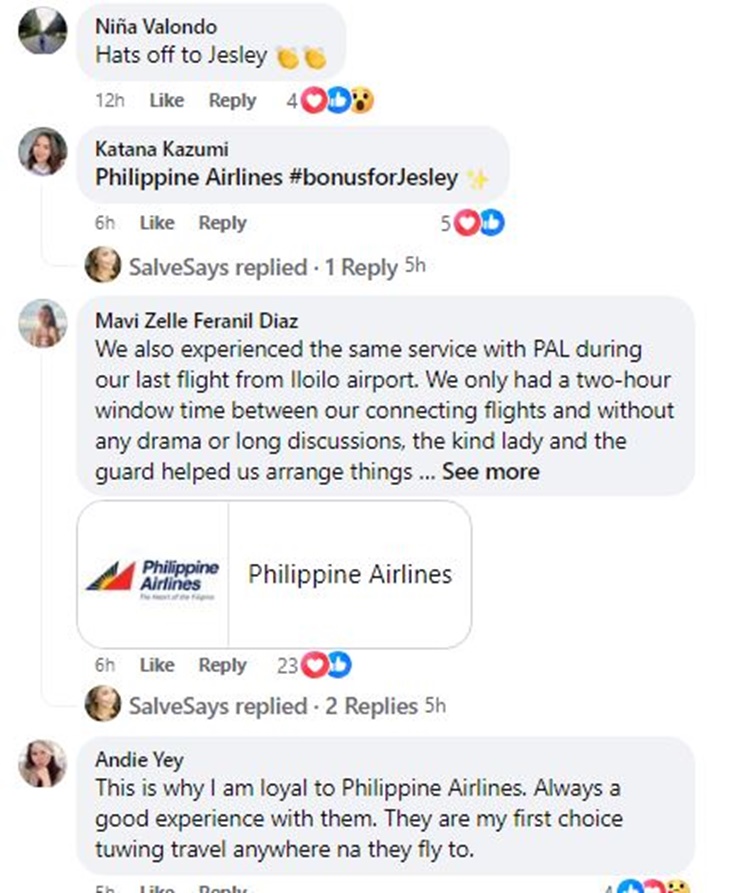 PAL noticed her post and left a comment: “Hi, SalveSays. We appreciate you for taking the time to share this story. We are beyond thrilled to hear about the exceptional service Jesley provided. It’s team members like him who truly embody the spirit of Philippine Airlines, going above and beyond to ensure our passengers have a seamless and pleasant journey. We’ll make sure he gets the recognition he deserves for his efforts and is commended for his actions.”