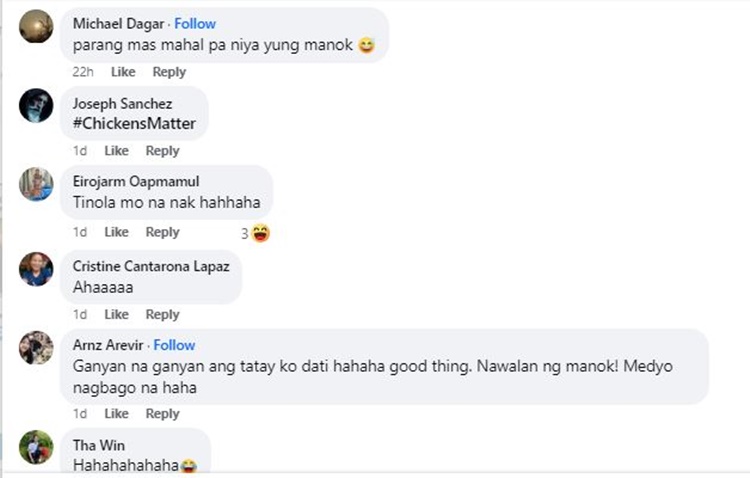 “Panay na siya message na paki-picturan daw yung manok niya. Ako naman po ‘di ko ma-picturan nang maayos kasi ang dumi ng baha, delikado din,” she added.