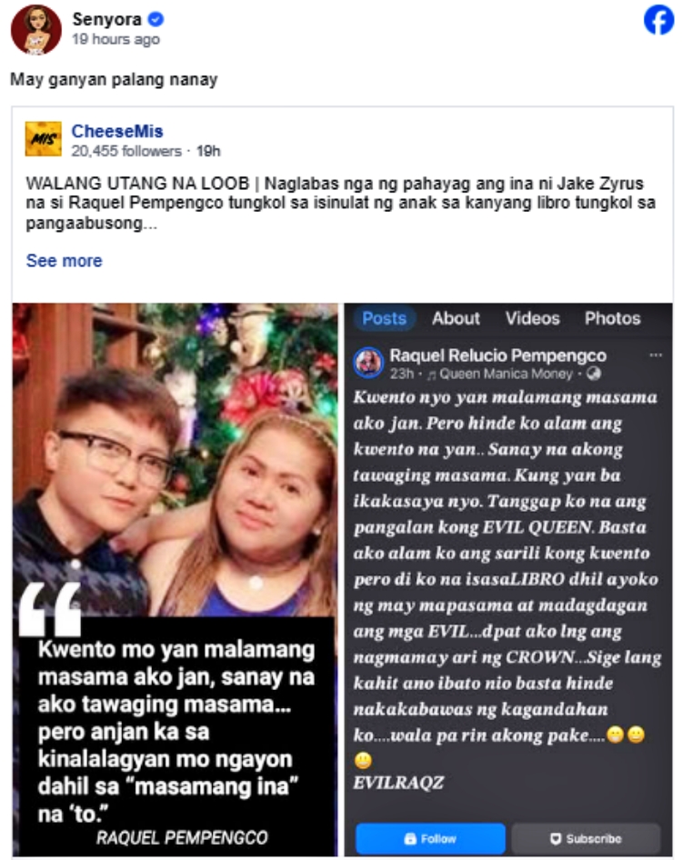 In her retaliation, Raquel called Jake’s “revelation” fake news. Senyora shared a post about Raquel’s statement, based on the article in PEP. The social media personality captioned the post with, “May ganyan palang nanay.”