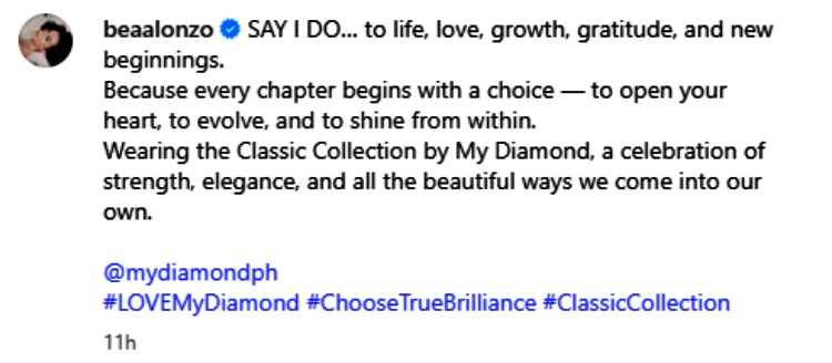 In the caption of her post, Bea Alonzo wrote, “SAY I DO… to life, love, growth, gratitude, and new beginnings. Because every chapter begins with a choice — to open your heart, to evolve, and to shine from within.”
