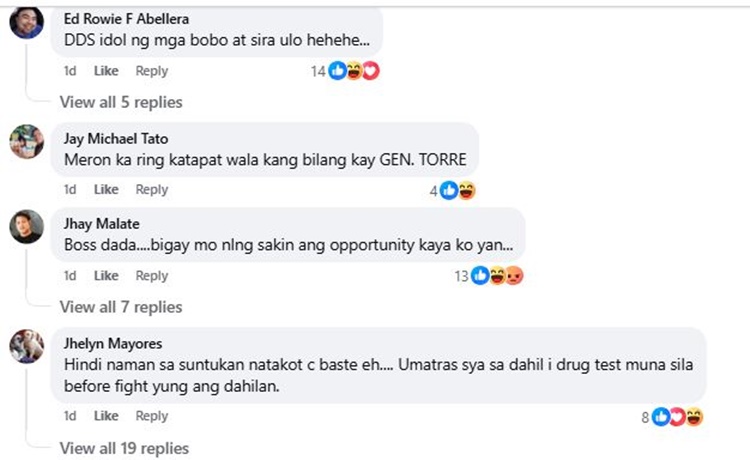 Boss Dada called out General Torre and volunteered to be Duterte’s substitute in the ring. He expressed readiness to face the police chief, saying it would be a way to support his friend, the vice mayor.