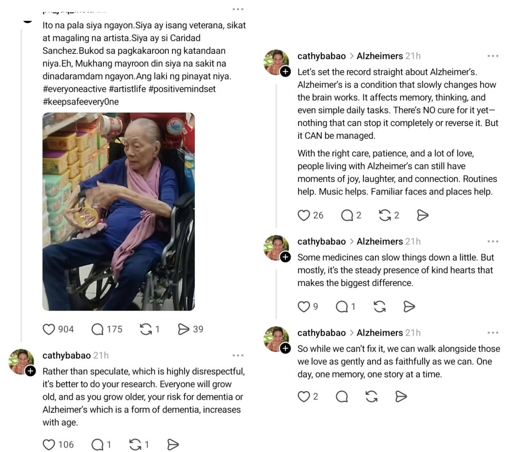 The daughter of Caridad Sanchez preaches to a netizen about Alzheimer’s disease
