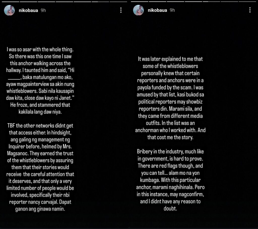 Niko Baua shared that major news outlets unified on this, and they waited for NBI to complete the investigation. He said that this was the largest scam that the agency had investigated that involved old political clans.