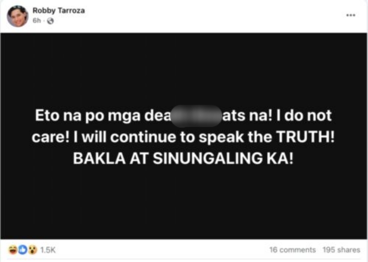 Robby did not stop there. He once again dedicated a post to his revelation about the Senator. The former actor called the politician. “BAKLA AT SINUNGALING.“