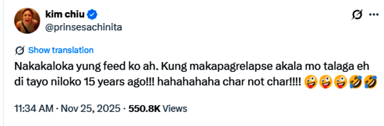 In a post on her X, formerly Twitter, account, Kim Chiu reacted to the reactions of Kimerald fans, and this was a fiery one. “Nakakaloka yung feed ko ah. Kung makapagrelapse akala mo talaga eh di tayo niloko 15 years ago!!! hahahahaha char not char!!!!” she wrote in her tweet.