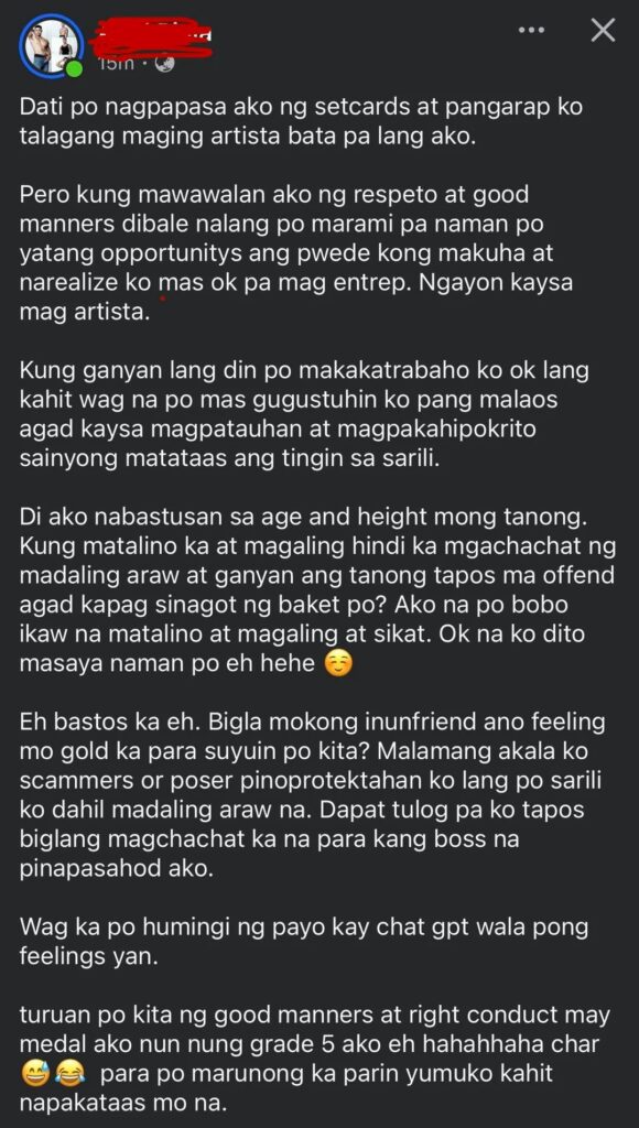 In a Facebook post, “Ariel” said that it has been his dream to be in the entertainment industry, but he is willing to find other opportunities if his respect and good manners are gone. He also said that it was not about the question regarding his age and height, but the fact that Direk Darryl Yap messaged early in the morning and got offended with his “bakit po?” reply.