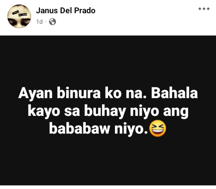 This was followed by his “New Year’s Resolution.” “Wag magbiro sa di mo ka humor. [rolling on the floor laughing emoji] Move on na ko sa life. Bahala na kayo dyan. Good night,” Janus del Prado wrote.