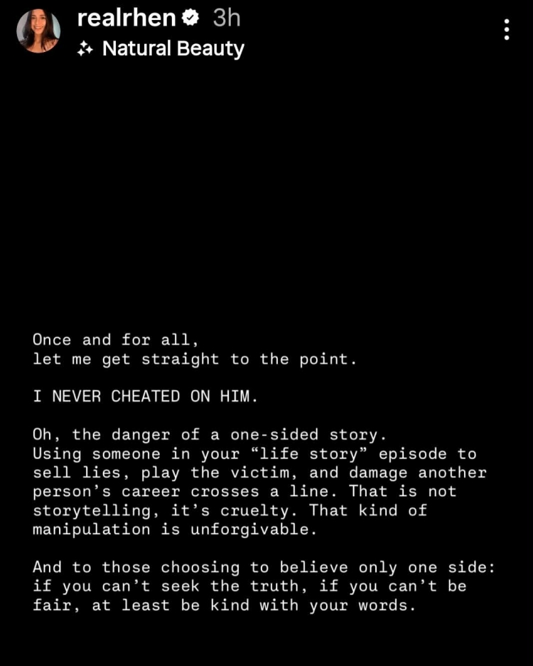 Rhen also has a message to those who believe in a one-sided story. “And to those choosing to believe only one side: if you can’t seek the truth, if you can’t be fair, at least be kind with your words,” the actress said.